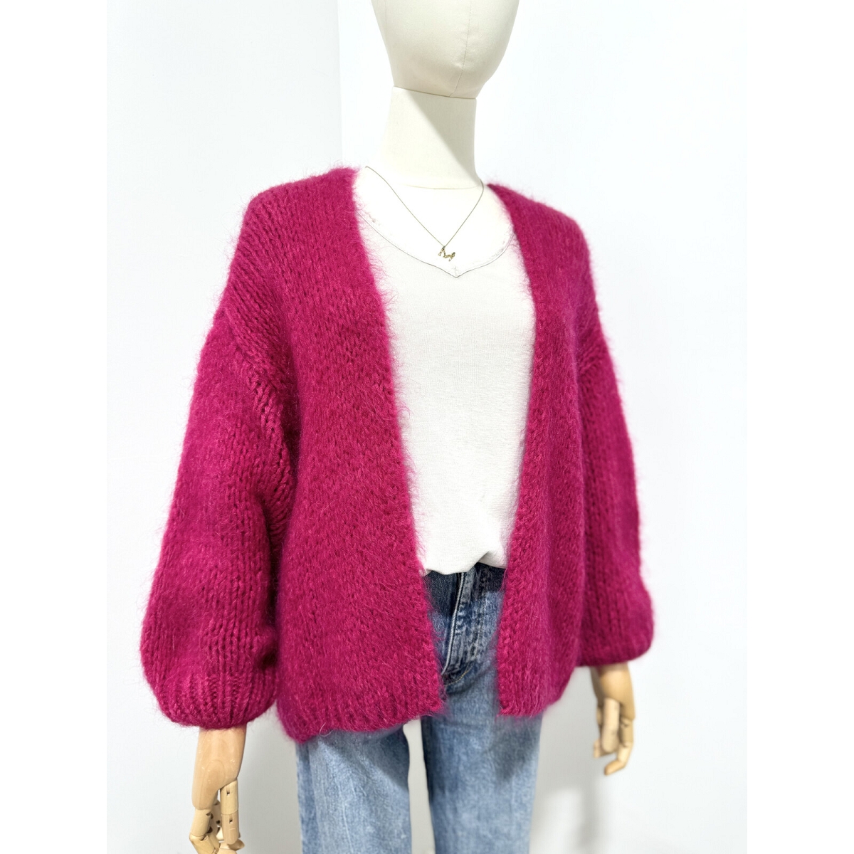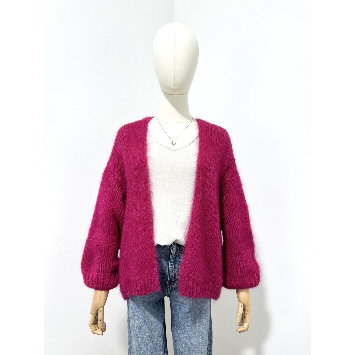 Cardigan col V, boutons apparents et manches légèrement ballon.