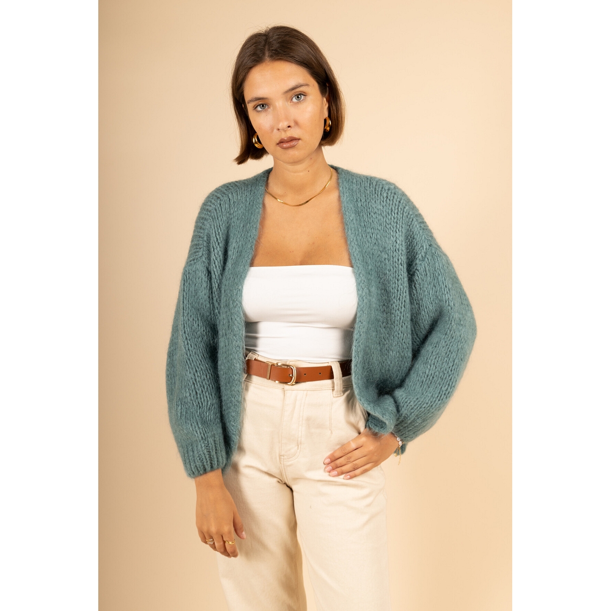 Cardigan col V, boutons apparents et manches légèrement ballon.