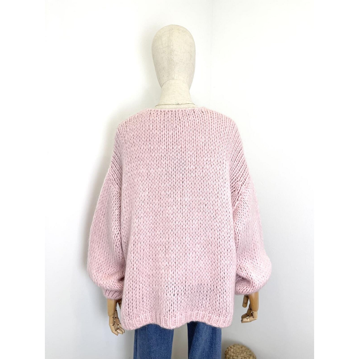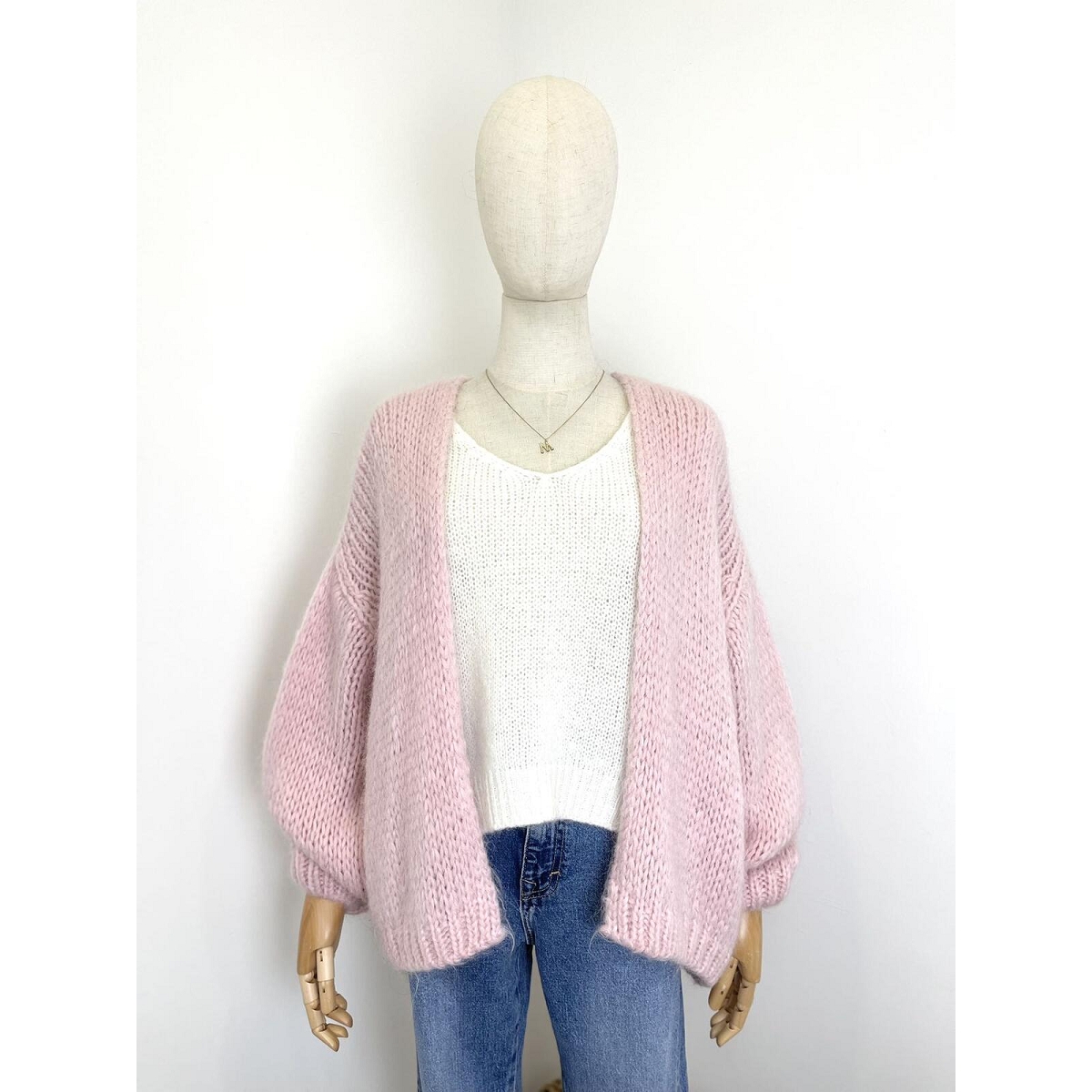 Cardigan col V, boutons apparents et manches légèrement ballon.