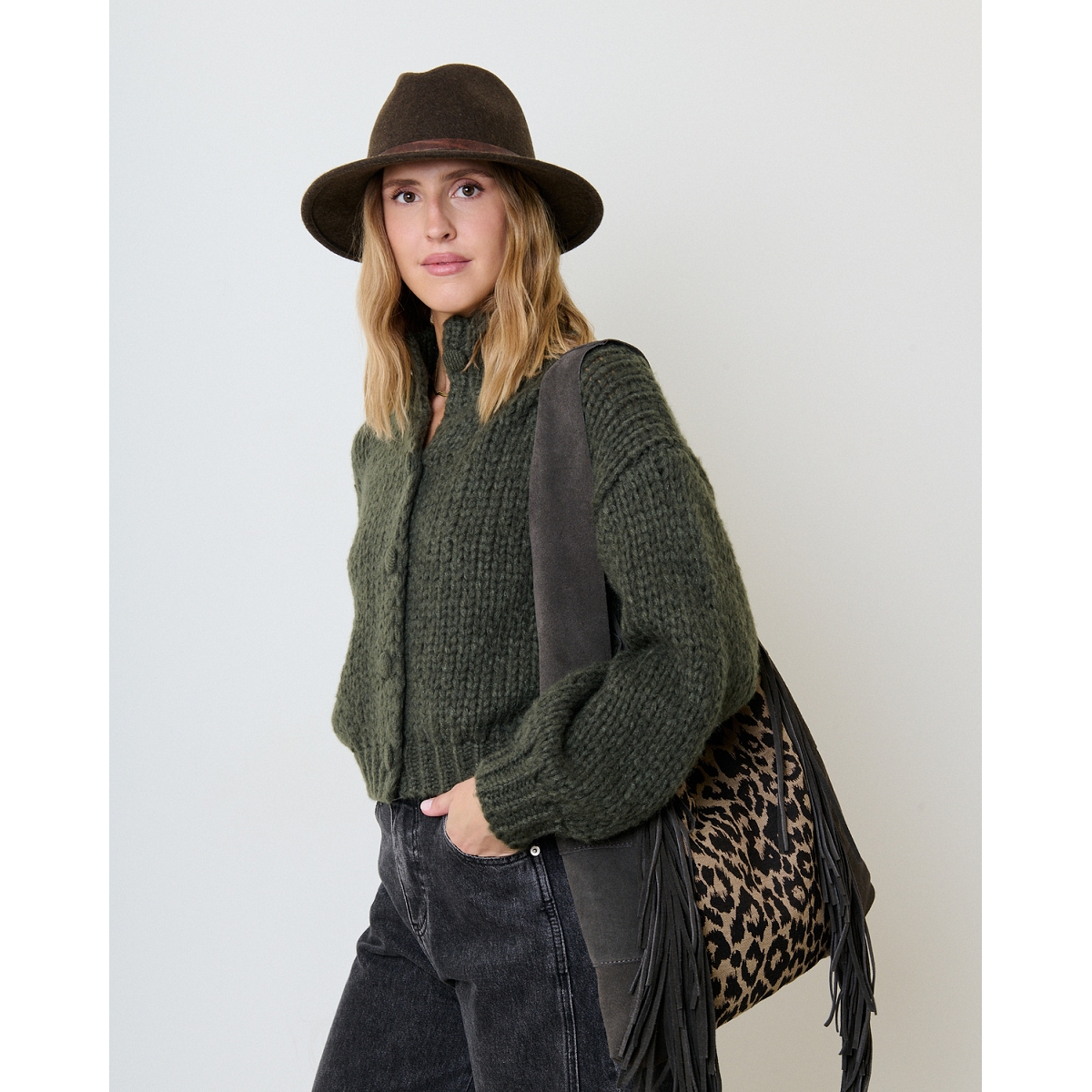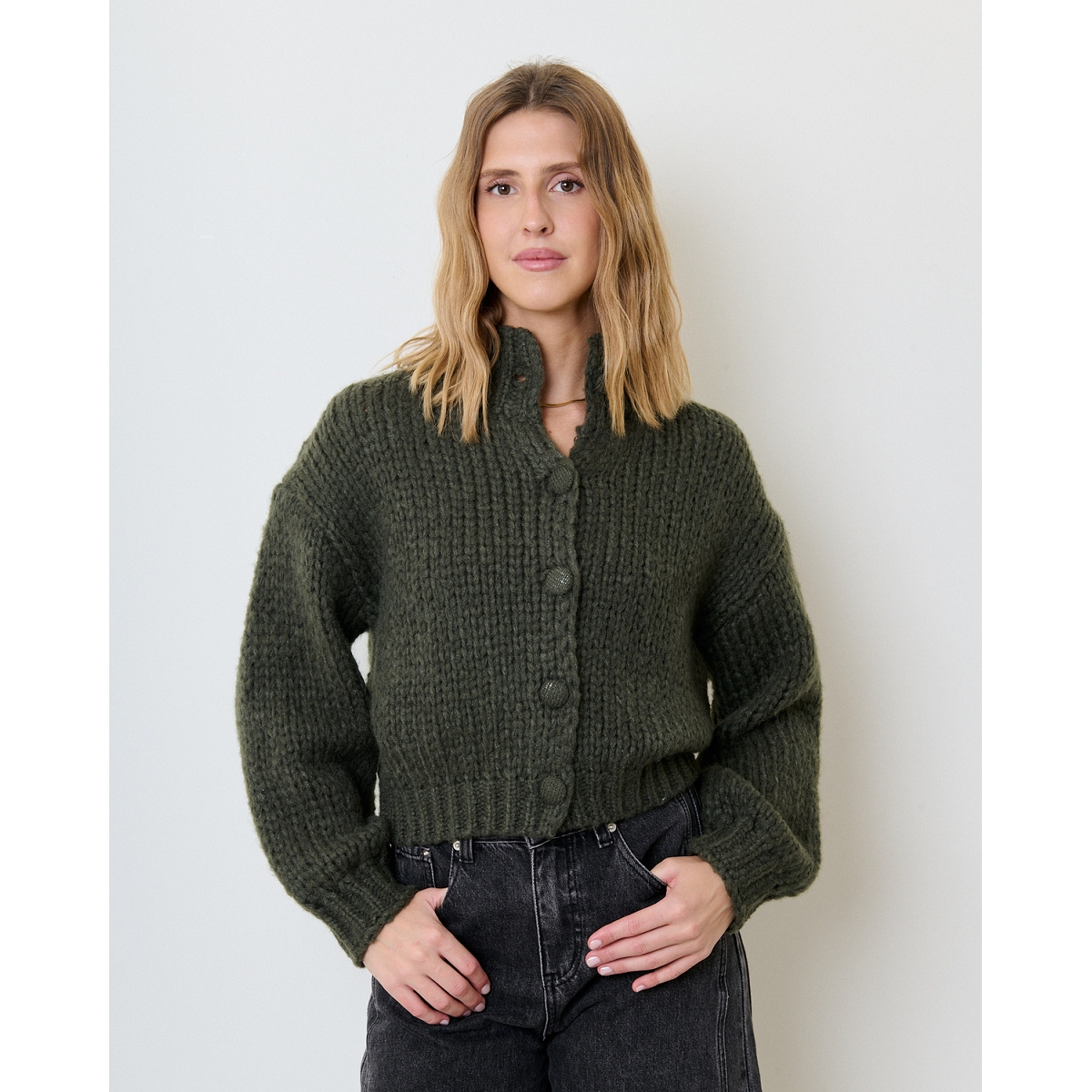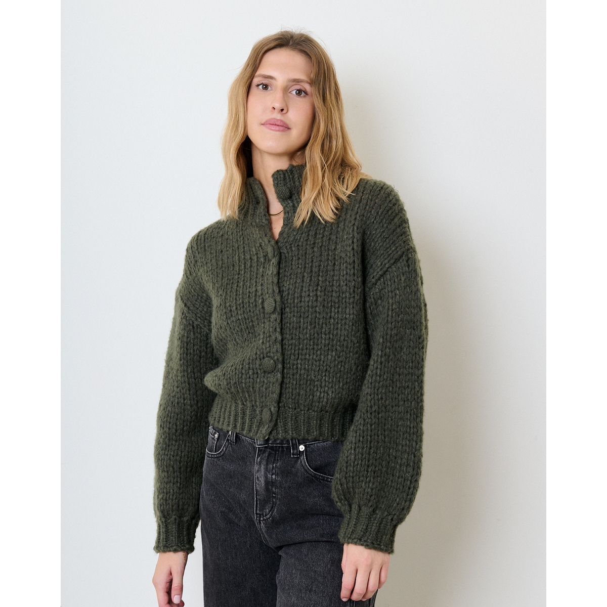 Gilet col V, boutons apparents et manches légèrement ballon.