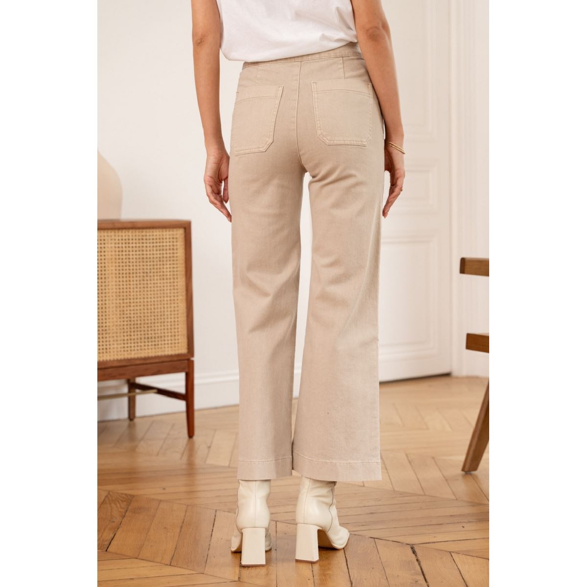 Ces pantalons Chino à la mode sont acclamés pour la forme large de la jambe à la mode et pour la taille haute.