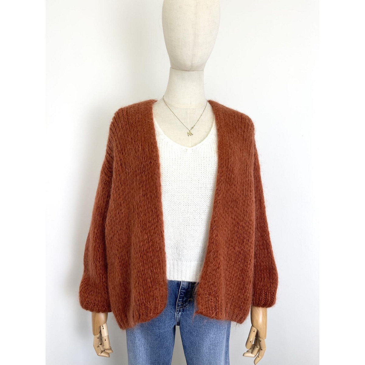 Cardigan col V, boutons apparents et manches légèrement ballon.