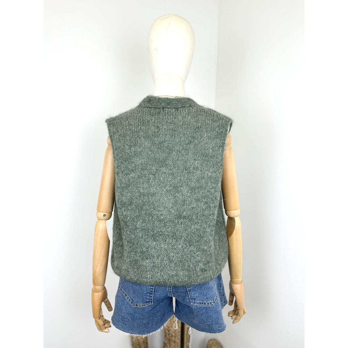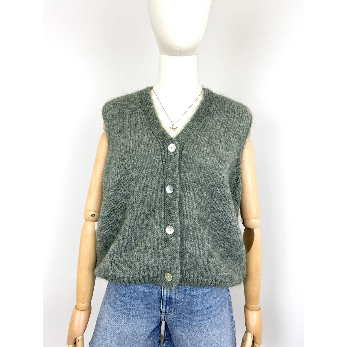 Gilet col V, boutons apparents et manches légèrement ballon.