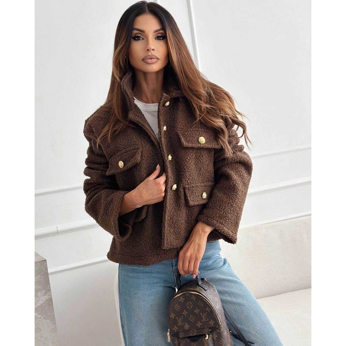 Scarpy creation veste bouclee a bouton doree marron